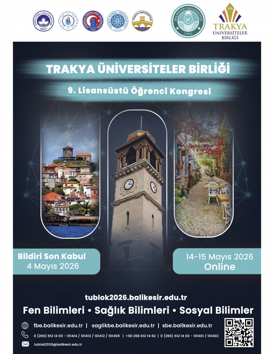 Üniversitemiz bünyesinde çevrim içi düzenlenecek olan Trakya Üniversiteler Birliği "9. Lisansüstü Öğrenci Kongresi" 14-15 Mayıs 2026 tarihinde gerçekleştirilecektir. Bildiri son kabul tarihi: 4 Mayıs 2026'dır